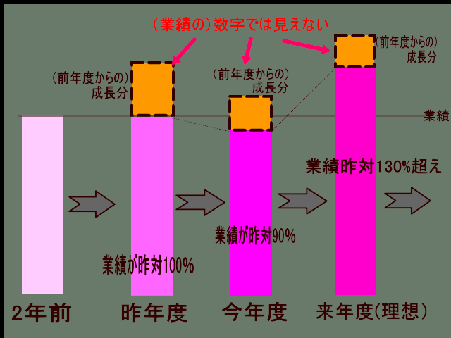 『本年度の成績=(昨年度の実績対比100%)+(経験やスキルアップなどの成長分)』があって初めて評価されるべきなのではないかと思います。