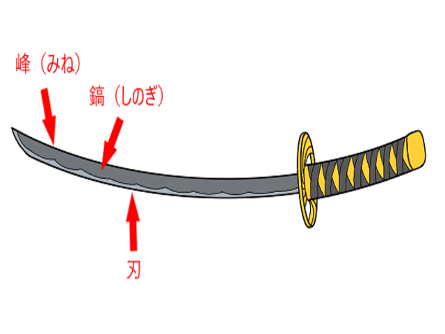 「しのぎ(鎬)」は、刀の刃と峰の中間部分の少し盛り上がったところで