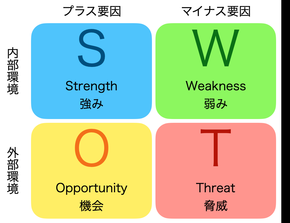 『自社の商品の品質やブランド、値段といった内部環境と、競合やトレンドといった外部環境(※『そこはかとなく外部環境…』を参照)を「強み(Strength)」「弱み(Weakness)」「機会(Opportunity)」「脅威(Threat)」の4つに分類し、最適ビジネス戦略(経営やマーケティング)を考えるためのフレームワークで「会社として今後どの部分に投資すべきか」の要素を絞り込める有効な分析手段の一つとされています』