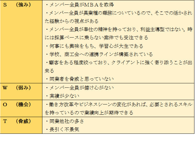 上記の「強み×機会」でいうと、「(MBA取得者)×(ビジネス環境の変化)」で「中・小規模事業者にも必ずビジネス環境の変化が訪れるため、経営を学んだ我々の出番があるのではないか」と考えることもできます。(あくまでも例として)